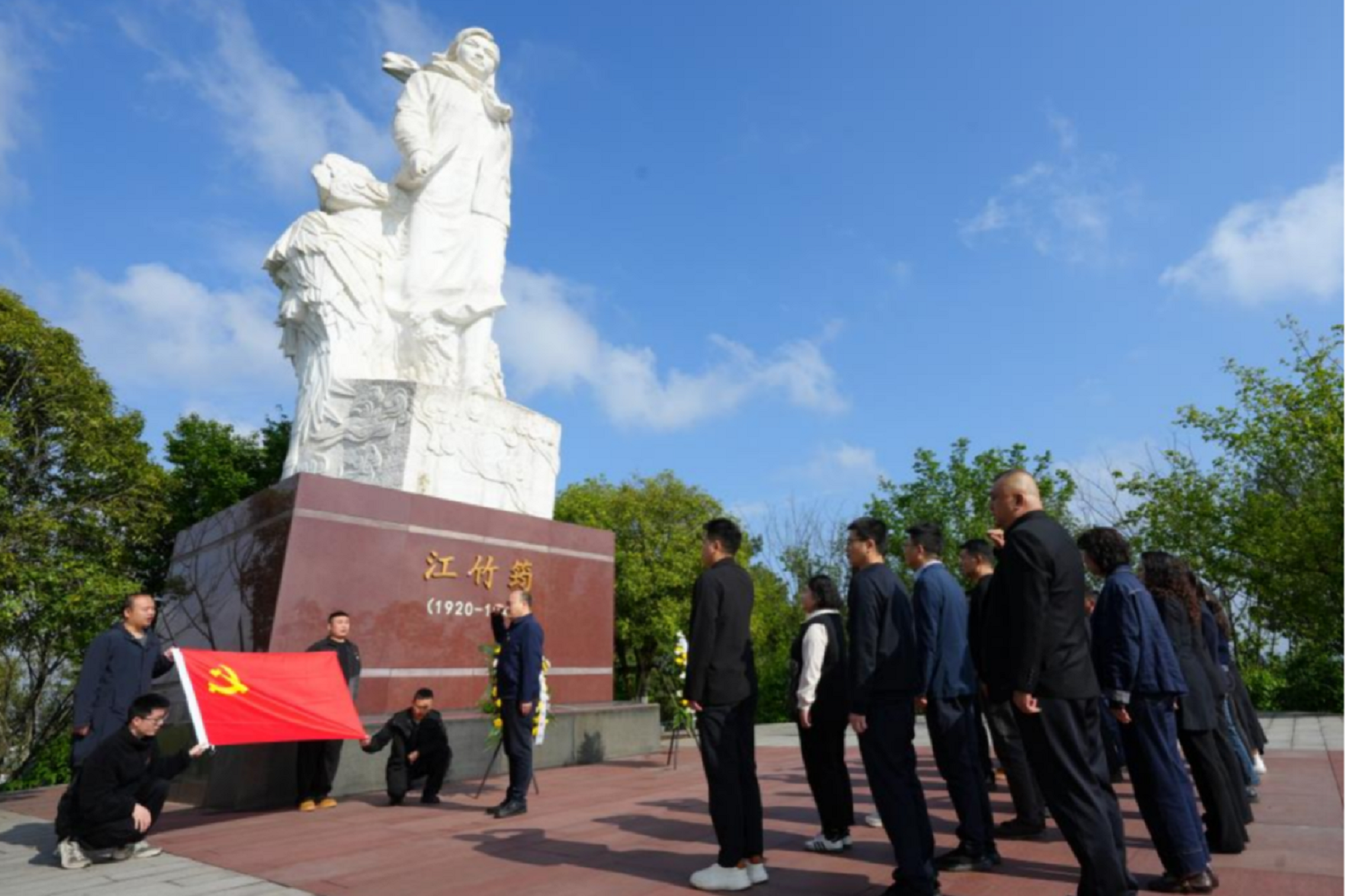 在官印山红梅雕像广场,大家神情肃穆、列队而立,向江竹筠烈士敬献鲜花,深切寄托对革命英烈的无限哀思与崇高敬意。面对鲜红党旗,全体党员高举右拳、庄严宣誓,重温入党誓词,铿锵誓言回荡现场,进一步坚定对党忠诚的政治信念,强化担当作为的使命自觉。